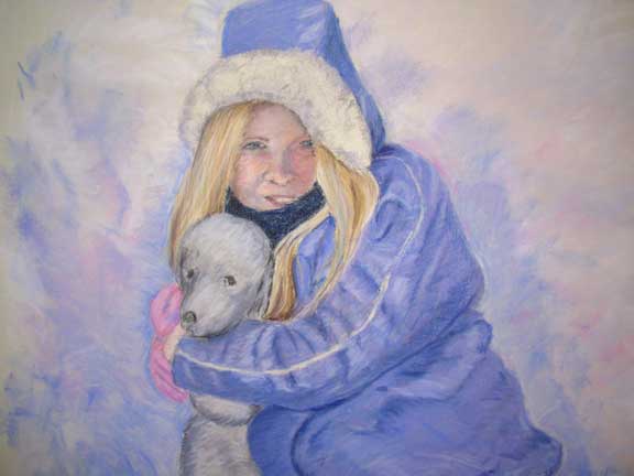My daughter Jacqueline plopped into a fresh pile of fluffy snow and grabbed the neck of our favorite stone dog for this pose.